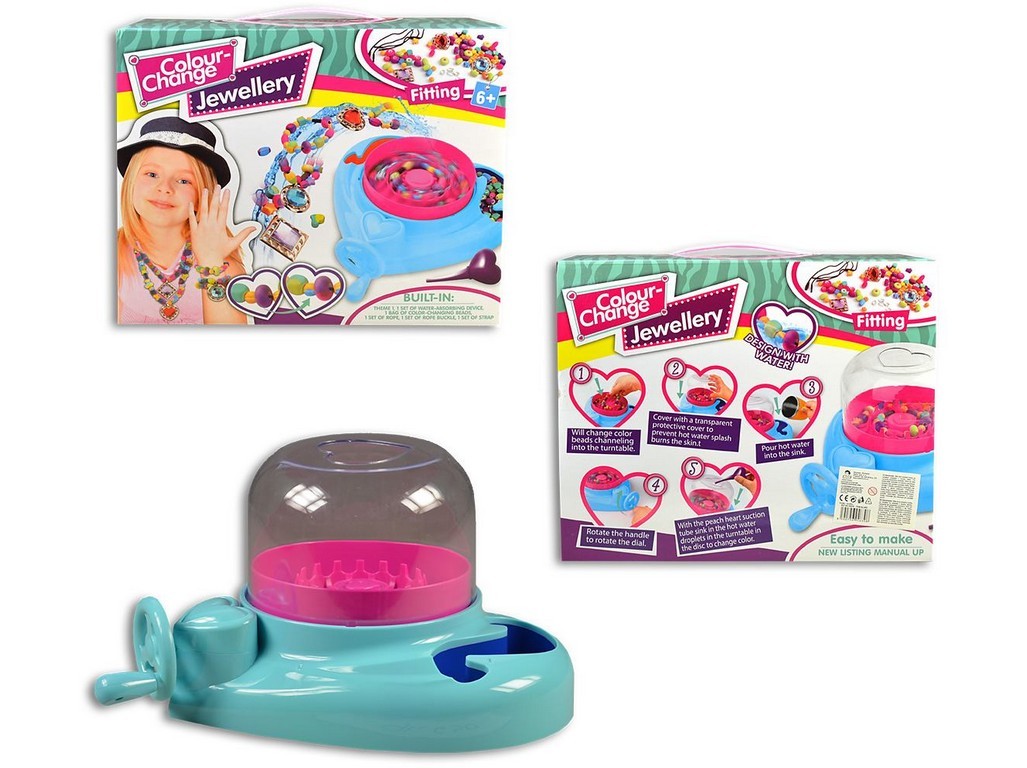 Souprava korálků Korálky se nasypou do rotační nádoby, uzavřou se víkem, přidá se horká voda do nádržky a pomocí kliky se otáčí obsahem nádoby. Kapátkem ve tveru srdce se pak přidává horká voda přímo do rotační nádoby a na základě kontaktu s horkou vodou se začnou měnit barvy korálků. Je možné si vytvořit takto i duhové korálky. Změň barvy korálků a vytvoř si svůj designový náramek podle sebe! Balení obsahuje cca 49 korálků v 5 pytlíčkách, 3 brože, 1 provázek, 2 kapátka, 3 přísavky, 3 kovové úchytky - zřejmě k brožím, 4 gumové části zřejmě určené k provázku, návod + přístroj složený se 2 částí.