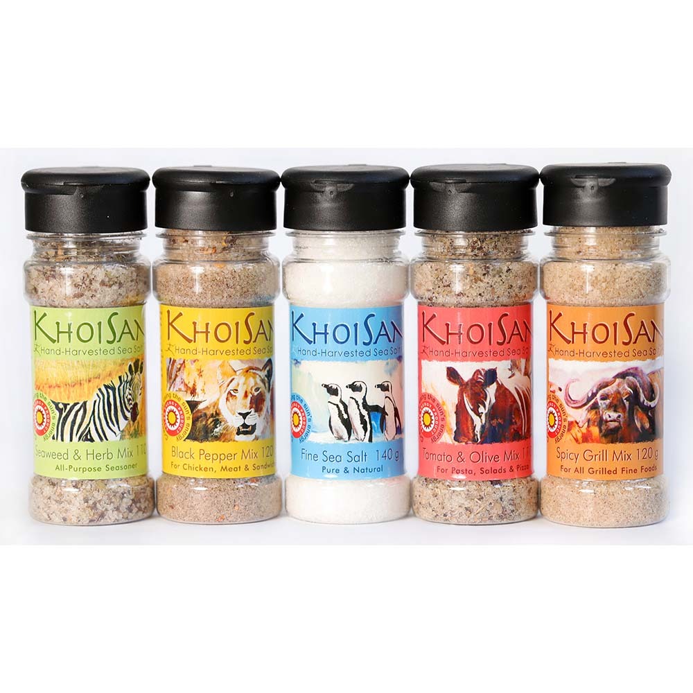 - Spicy Grill Mix (120 g): ručně sbíraná mořská sůl KhoiSan, chilli, kajenský pepř, paprika, divoký česnek, kmín, divoká dagga (divoké konopí, lvoušek oranžový, Leonitis leonurus), buchu a koření.
