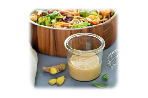 Mrkve, cibulku a zázvor rozmixujte nahrubo. Přidejte olej, ocet, kokosové aminos, cukr, sůl a mixujte do hladka. Přelijte do uzavíratelné nádoby a skladujte v lednici po dobu jednoho týdne. Dresink je vhodný do salátů či těstovin.
