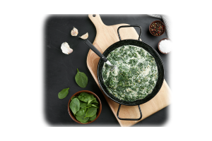 Ve velké pánvi rozehřejte olivový olej a přidejte nakrájenou cibuli. Přidejte česnek a zázvor. Do pánve postupně přidávejte špenát a nechte jej změknout. Přilijte kokosové mléko a nechte probublávat, dokud omáčka nezhoustne. Poté přidejte kajenský pepř, kari, papriku, sůl a promíchejte.