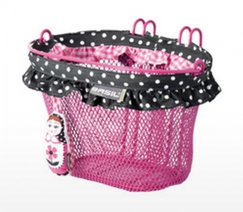 Drátěný zdobený dětský koš na řidítka Délka: 280 mm Šířka: 190 mm Výška: 190 mm Materiál: ocelová síťovina s výztužemi a látkovým lemem Upnutí na řidítka pomocí háků Barva: růžovo - černo - bílá s přívěškem Babuška Balení: servisní v sáčku