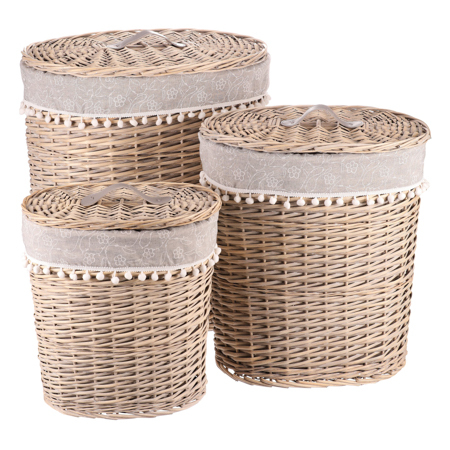 Sada tří kulatých proutěných prádelních košů s víkem v přírodní barvě, které jsou vyloženy šedou látkou s okrasnými kulatými třásněmi. Elegantní a praktický doplněk do vaší domácnosti, který dodá prostoru útulnost a uspořádanost, přičemž vám pomůže s úschovou špinavého prádla.