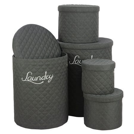 Sada pěti kulatých prádelních košů o různých velikostech v černých barvách je ideálním pomocníkem do každé domácnosti. Všechny jsou potaženy hebkou látkou, což zajišťuje nejen elegantní vzhled, ale i příjemný dotek. Tyto koše pomohou v každé domácnosti efektivně uschovat prádlo, a zároveň udržet prostor čistý a uklizený.