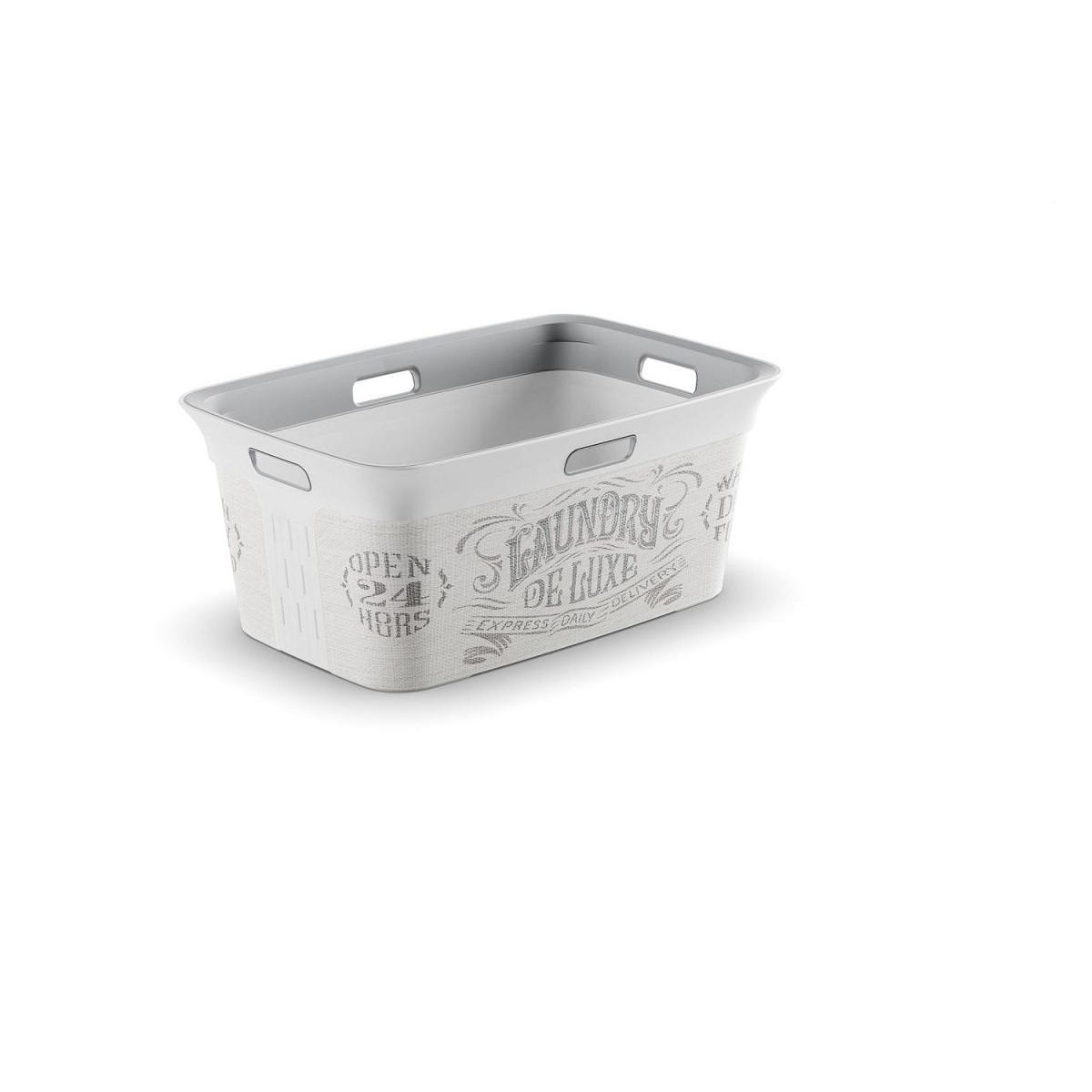 Koš na prádlo má kapacitu 45 litrů. Díky postranním rukojetím se snadno přenáší i maximálně naplněný. Je dodáván v šedém provedení s potiskem.