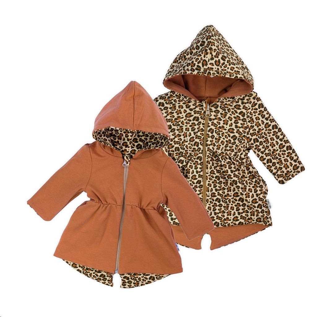 Oboustranná kojenecká mikinka s kapucí Nicol Mia. Mikinka má zapínání na zip po celé délce, zadní strana je prodložená a v pase je mírně tvarovaná a stažená. Zip je u krčku zakrytý, což je velmi praktické a pohodlné. Kapuci zdobí podšívka se vzorem leopardí srsti v případe že je mikinka hnědá. V případe, že je mikinka se vzorem leopardí srsti, podšívka kapuce je v hnědé barvě. Fantazie v oblékání nezná hranic a záleží jen na vás, jak mikinku dokážete doladit s oblečením kolekce Mia. Složení: 95% bavlna, 5% elastan, podšívka: 100% bavlna.