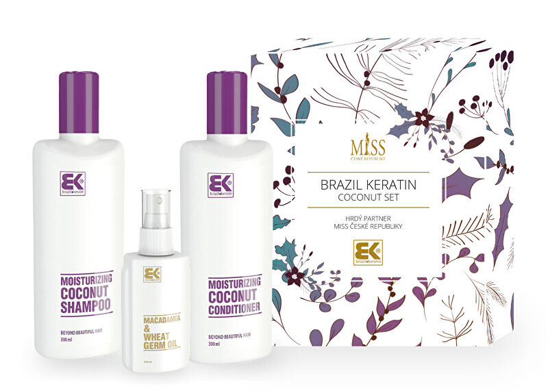 Miss Coconut Set - Kosmetická sada vlasové péče Dopřejte svým vlasům výživu, hydrataci a lesk. Rozmazlujte své vlasy se sadou výrobků na vlasy Brazil Keratin Coconut, která obsahuje šampon, kondicionér a makadamiový olej. Tato sada je určená k hloubkové regeneraci poškozených vlasů. Dopřejte svým vlasům krásný vzhled a luxusní péči. Jemný kokosový šampon pro poškozené vlasy (Moisturizing Coconut Shampoo) Velmi jemný šampon s keratinovým regeneračním systémem dodá vlasům potřebný keratinový hydrolyzát, který se podílí na hloubkové regeneraci poškozených vlasů. Vlastnosti: - šampon je vyroben v BIO formulaci, - neobsahuje silikony, ropné produkty, etoxyláty ani parabeny. Jak používat: Šampon naneste na mokré vlasy naředěný vodou v poměru 1:3 (3 díly vody), napěňte a poté opláchněte. Následně použijte kondicionér nebo masku. Keratinový vlasový kondicionér pro suché vlasy (Moisturizing Coconut Conditioner) Keratinový vlasový kondicionér s excelentním regeneračním efektem je určený pro suché vlasy. Obsahuje keratinový hydrolyzát, který se podílí na hloubkové regeneraci poškozených vlasů. Vlastnosti: - kondicionér je vyroben v BIO formulaci, - neobsahuje silikony, ropné produkty, etoxyláty ani parabeny. Jak používat: Na mokré vlasy naneste potřebné množství kondicionéru, důkladně krém do vlasů zapracujte. Nechte 2 minuty působit, následně opláchněte teplou vodou a vysušte. Makadamiový olej (Macadamia & Wheat Germ Oil) Makadamiový olej má vynikající regenerační účinky, podporuje schopnost přirozené hydratace pokožky a vlasů. Jak používat: Pokožka: potřebné množství oleje naneste na pokožku a rozetřete. Vlasy: olej vmasírujte do vlhkých vlasů, zabalte do igelitu, přikryjte ručníkem nechte působit 15- 30 min. Poté důkladně umyjte jemným šamponem a dle potřeby použijte kondicionér.