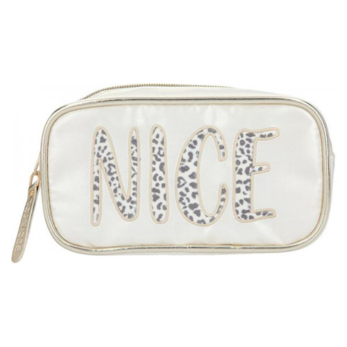 V této kosmetické taštičce si snadno vezmete svůj make-up nebo psací potřeby s sebou. Taštička má béžovou barvu se zlatými detaily a vyšitým nápisem NICE. Uzavíratelná na zip.Rozměry: 19 cm x 10 cm x 6,5 cm.