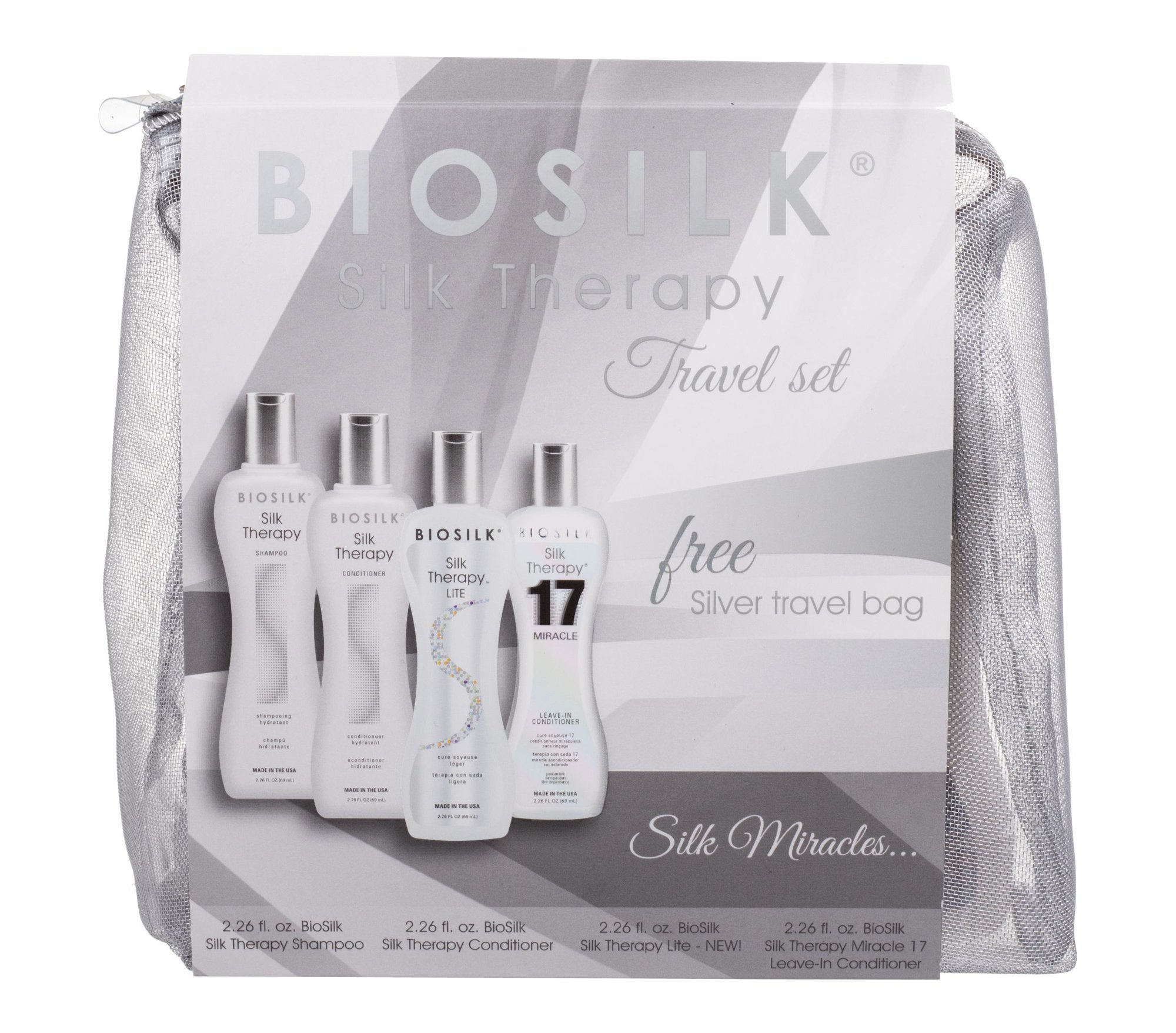 Sada vlasové péče **Farouk Systems Biosilk Silk Therapy**. **Složení kazety**: **Šampon 67 ml** Regenerační hedvábný šampon pro všechny druhy vlasů, zejména pro poškozené vlasy. Vhodný zejména pro vlasy poničené, které jsou často chemicky ošetřované. Jemně čistí a posiluje vlasy, zanechává je lesklé. Obsahuje hedvábné proteiny, rostlinné výtažky a vitamíny. Šampon navíc intenzivně hydratuje vlasy, dodává jim objem, chrání před škodlivými účinky UV paprsků a také vysokou teplotou. **Použití:** Aplikujte na mokré vlasy, napěňte a opláchněte. **Kondicionér 67 ml** Hedvábný vyživující a regenerační kondicioner vhodný pro poškozené vlasy. Intenzivně vlasy hydratuje. Obsahuje přírodní hedvábí, rostlinné výtažky a vitamíny. Usnadňuje česání, vlasy nezatěžuje dodává jí elasticitu a zanechává je hedvábně hladké. **Použití**: Aplikujte na omyté vlasy, nechte chvíli působit a poté důkladně opláchněte. **Sérum na vlasy Silk Therapy Lite 67 ml ** Farouk Systems Biosilk Silk Therapy Lite je jemná péče, která šetrně regeneruje a vyživuje vlasy. Obsahuje výtažky z hedvábí, které vlasy vyživují a dodávají jim sílu a pružnost. Po použití budou vlasy silnější, odolné a zdravé. **Použití**: Aplikujte malé množství na suché nebo vlhké vlasy. Nanášejte po celé délce vlasu od kořínků po konečky. Neoplachujte. **Bezoplachový kondicionér 17 Miracle 67 ml ** Vyživuje, hydratuje a regeneruje vlasy i pokožku hlavy. Okamžitě dodává vlasům objem a sílu. Bohaté složení vlasy pomáhá chránit, zabraňuje třepení konečků a celkově vlasy revitalizuje. Zanechává vlasy svěží, plné objemu a síly. **Použití**: Aplikujte na umyté a ručníkem vysušené vlasy. Jemně vmasírujte. Neoplachujte. **Kosmetická taška**