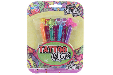 Balení obsahuje gelová tetovací pera ve 4 barvách s přívěsky. Baleno na kartě. Rozměry balení 14,5 x 18,5 x 1 cm. Věk 3+ (doporučeno od 5 let)