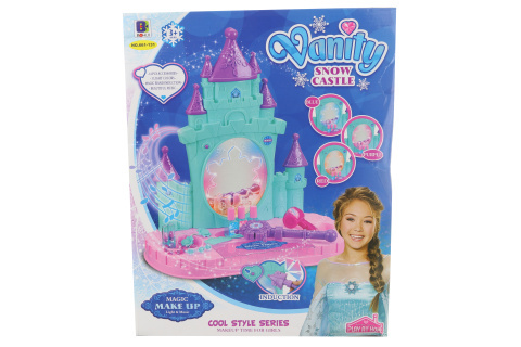 Toaletní stolek pro malé parádnice. Stoleček je ve tvaru zámku a vydává zvuky a svítí. Balení obsahuje toaletní stolek se zrcadlem, hřeben, fén, hůlku a mnoho dalších doplňků. Napájení na 3 AA baterie (nejsou součástí balení). Rozměry stolečku cca 44 x 46 x 22 cm. Rozměry balení cca 44 x 35 x 10...