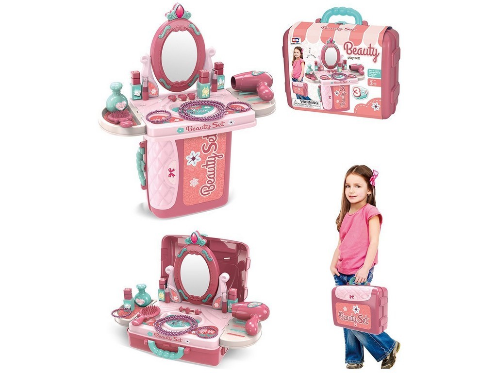 Kosmetický stolek se zrcadlem a spoustou nezbytného příslušenství pro malou slečnu. Kosmetický set je zakomponován do elegantního přenosného kufříku. Během chvilky je možné vše nutné poskládat do kufříku a připravit se na cestu k babičce nebo kamarádce. Rozměr složeného kufříku je 27,2 x 10,3 x 21,8 cm. Vhodné pro děti od 3 let.