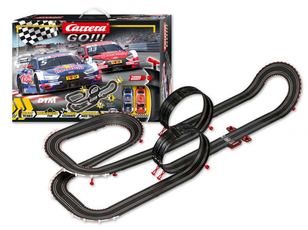 Autodráha Carrera GO!!! dlouhá 8,9m s dvěma auty Audi RS 5 DTM, obsahuje rovinky, zatáčky, looping, kolmou stěnu, díl s počítadlem kol a další díly. Můžete si sestavit další různé trati podle plánu na obalu.
