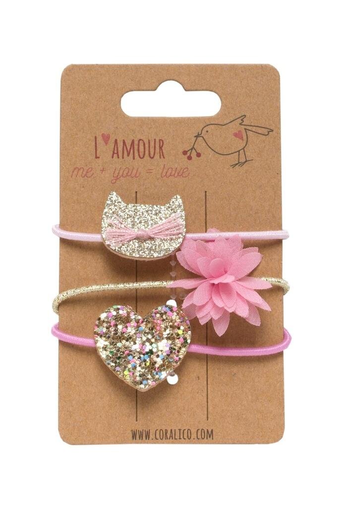 Zestaw gumek z motwem kotka, kwiatka i serduszka. Odcienie różu, bieli i złota číst celé