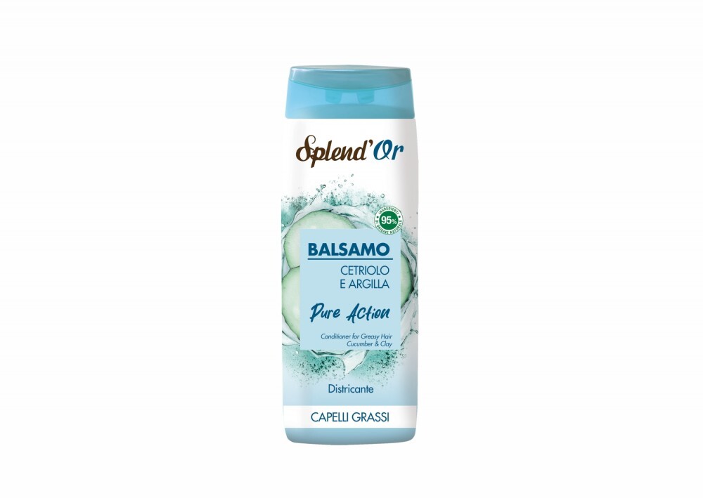 Pro čisté a vzdušné vlasy, okurkový a jílový kondicionér řady Splend´Or Pure Action je pro vás řešením. Jeho nové veganské složení s 95 % ingrediencí přírodního původu, obohacené o směs okurky a jílu a kombinací výtažků z kopřivy, šalvěje a zeleného čaje oživuje vlasy, pomáhá obnovit jejich přirozený lesk a hebkost a usnadňuje jejich rozčesávání. Nechte se zahalit svěžím spojením květinových a vodních tónů. Ideální pro použití v kombinaci s šampónem Splend´Or Pure Action Cetriolo e Argilla - okurka a jíl.