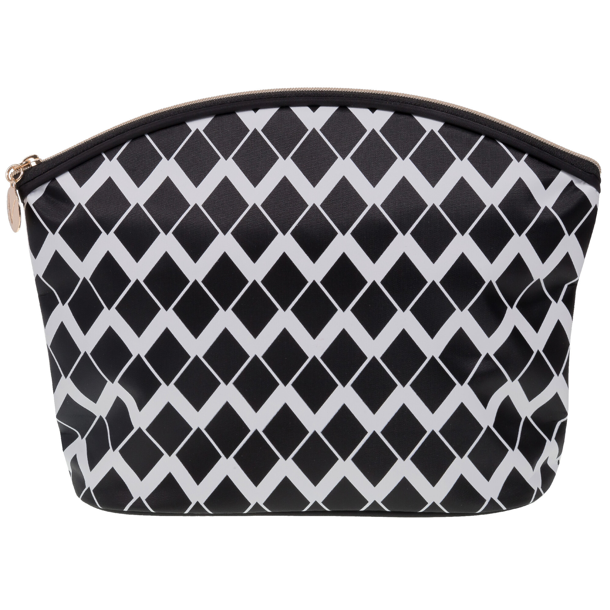 Kosmetická taška se vzorem kosočtverců v černobílém provedení se zlatým zipem.