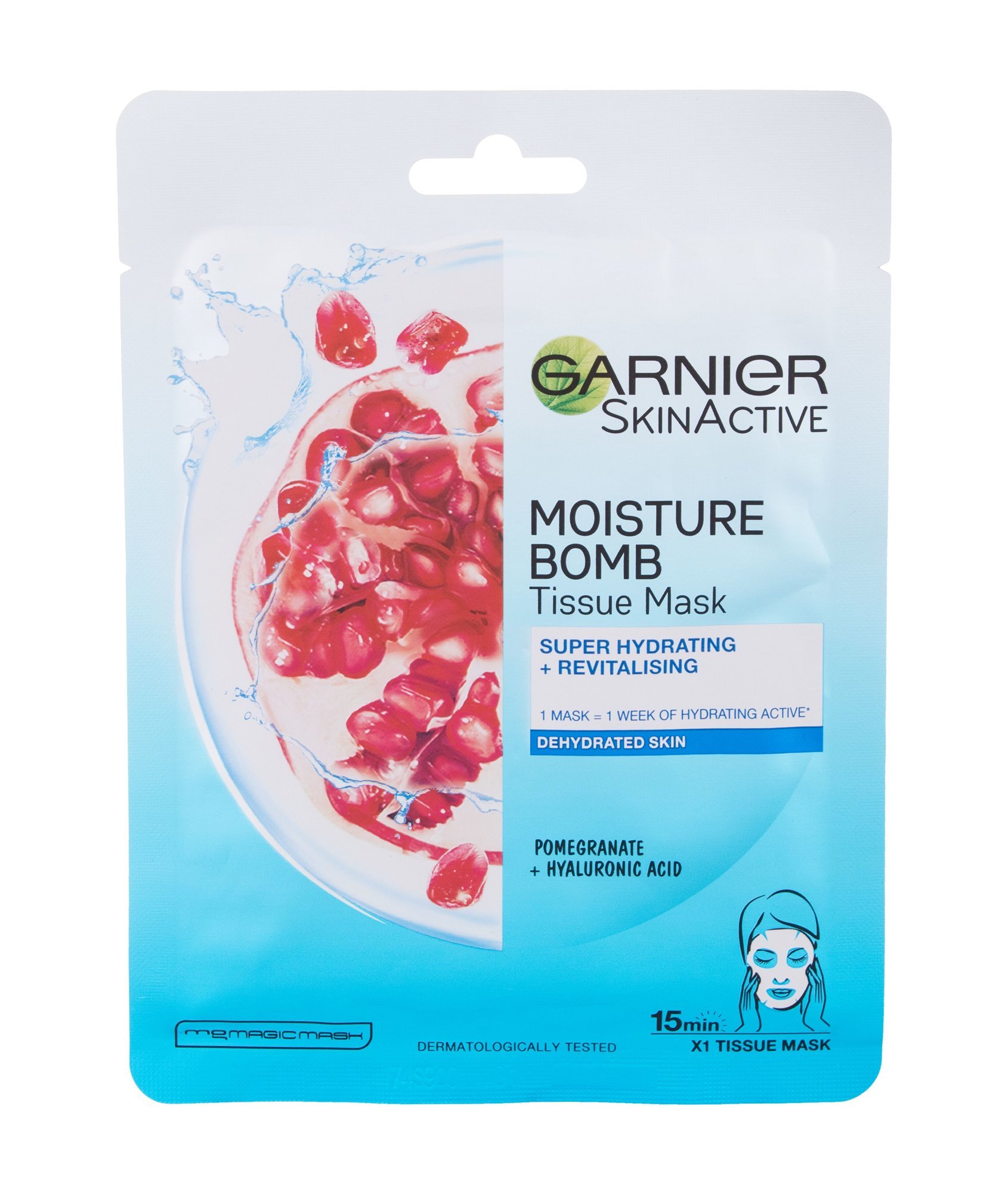Dopřejte své pleti intenzivní hydrataci s plátýnkovou maskou Garnier SkinActive Moisture Bomb Pomegranate. Její pečující složení vyhlazuje vrásky, zvyšuje pevnost a pružnost pleti a zanechává jí svěží. Za pouhých 15 minut ji vyživí, rozjasní a pomůže omladit její vzhled.