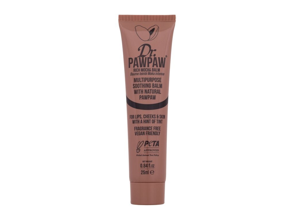 Balm Rich Mocha - Víceúčelový balzám na rty, tváře a oči 25 ml Seznamte se s tónovaným balzámem Dr. PAWPAW Balm Rich Mocha, kterým během chvilky rozjasníte rty, tváře a oči. Postará se o potřebnou hydrataci i výživu a ochrání pleť před působením volných radikálů. Pomáhá předcházet předčasnému stárnutí a zanechává pocit pohodlí na dlouhou dobu. Proč si vybrat Balm Rich Mocha? - propůjčí jemný barevný nádech, - okamžitě rozjasňuje pleť, - udržuje optimální hladinu hydratace, - omlazuje a zklidňuje, - nezanechává pocit mastnoty, - 98 % ingrediencí je přírodního původu, - veganské složení, - netestován na zvířatech, - lze použít na rty, tváře a oblast očí, - vhodný pro všechny typy pleti včetně citlivé. Jak správně používat Balm Rich Mocha? Nanášejte balzám prstem nebo kosmetickým štětečkem na rty, tváře a pleť kolem očí. Aplikujte potřebné množství, abyste vytvořila vzhled podle vašich představ.