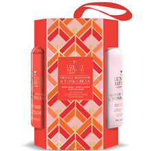 Pomerančový květ & Tonka fazoleNádherná kolekce s vůní pomerančových květů, vanilky a tonka fazolí je moderně zpracovaná, plná geometrických tvarů v odstínech červené a oranžové, se třpytivou zlatou fólií.