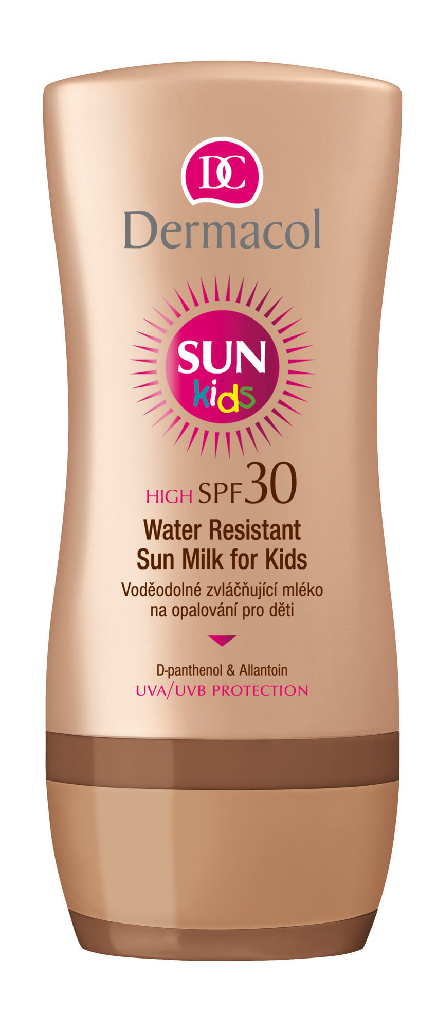Voděodolné mléko na opalování pro děti** Dermacol Sun Kids Milk SPF30**. Voděodolné mléko na opalování s beta-karotenem poskytuje účinnou ochranu před slunečním zářením. Ochranný komplex UVA a UVB filtrů spolu s vitaminem E a olejem z hroznových jader zabraňuje poškození pokožky vlivem UV záření a zamezuje předčasnému stárnutí. **Použití**: Aplikujte dostatečné množství 20 minut před opalováním. Opakujte po každém osušení či dlouhém pobytu ve vodě. Před použitím protřepejte. Nadměrná expozice slunci představuje vážné zdravotní riziko.