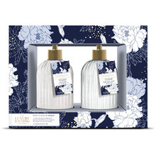 Pivoňka, Broskev & MalinaKvětinová vůně pivoněk a růží je doplněná vůní malin, pomerančů a slaďoučkých broskví. Nádherně vyvedené květiny na tmavomodrém podkladu dodává kolekci elegantní a ženský vzhled.