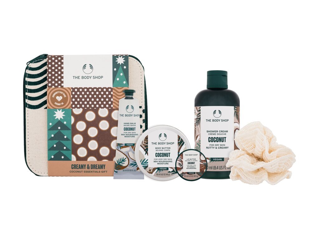 The Body Shop Coconut sprchový krém Coconut Shower Cream 250 ml + tělové máslo Coconut Body Butter 50 ml + balzám na ruce Coconut Hand Balm 30 ml + máslo na rty Coconut Lip Butter 10 ml + žínka + kosmetická taštička