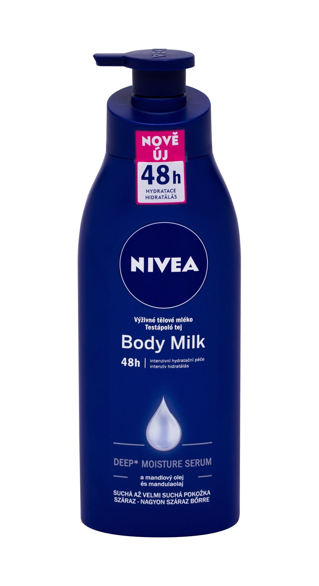 Výživné tělové mléko **Nivea Body Milk.** Bohaté složení s technologií HYDRA IQ intenzivně vyživuje a znatelně redukuje hrubost suché pokožky. Díky mandlovému oleji bude pokožka jemnější a vláčnější. **Použití:** Naneste na pokožku a lehce rozetřete.
