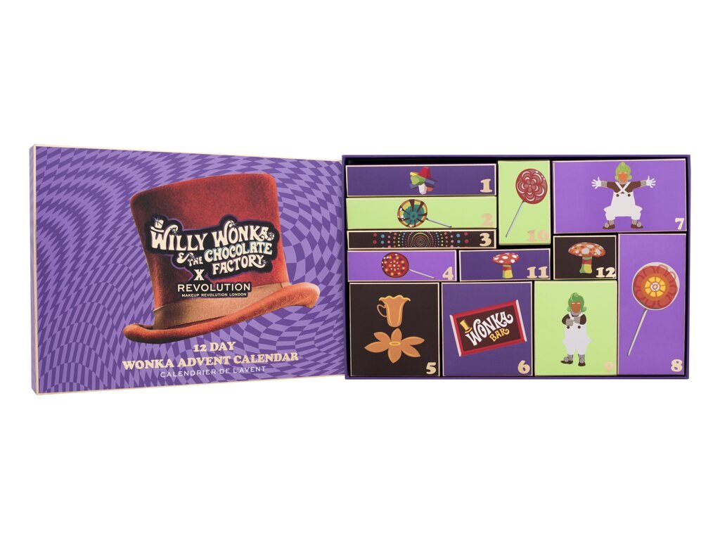 Makeup Revolution London Willy Wonka & The Chocolate Factory lesk na rty 2 ks + oční linka 1 ks + matující papírky 1 balení + tvářenka 1 ks + bronzer 1 ks + polštářky pod oči 1 pár + paletka očních stínů 1 ks + kosmetická houbička na make-up 1 ks + rtěnka