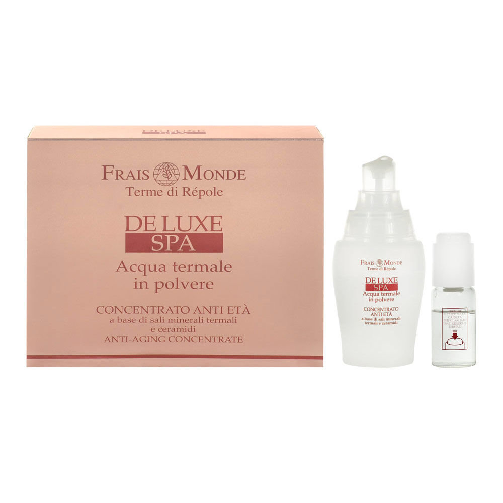 Koncentrovaná pleťová péče **Frais Monde Deluxe Spa Anti-Age Concentrate**. Pleťová péče Frais Monde Deluxe Spa Anti-Aging Concentrate proti projevům stárnutí pleti. Zpevňuje a vyhlazuje pleť. Redukuje výskyt vrásek a jemných linek. Zanechává pleť omlazenou, vitální a zpevněnou. **Složení kazety**: **Přírodní aktivní gel 40ml** **Voda 10ml** **Termální minerální sůl 1g** **Použití**: Stiskněte vrchní díl u vody (10ml), aby se rozpustila termální minerální sůl. Poté otevřete přírodní aktivní gel (40ml) a přelijte vodu. Důkladně protřepejte. Přípravek je připravený pro použití. Aplikujte na čistou pleť.