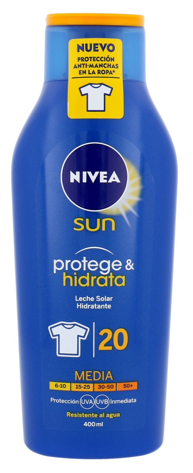 Hydratační mléko na opalování **Nivea Sun Protect & Moisture Sun Lotion SPF20**. Mléko na opalování Nivea Sun Protect & Moisture Sun Lotion SPF20 obsahuje účinný systém UVA/UVB filtrů, které dokonale chrání pokožku před škodlivým slunečním zářením. Dlouhodobě pokožku hydratuje a vyživuje. Zároveň snižuje riziko slunečních alergií. Zanechává pokožku jemnou a hebkou na dotek. **Účinky**: · účinně chrání pokožku · dodává pokožce potřebnou hydrataci a péči · snižuje riziko slunečních alergií **Použití**: Aplikujte na pokožku před sluněním. Opakujte dle potřeby, především po koupání nebo osušení.