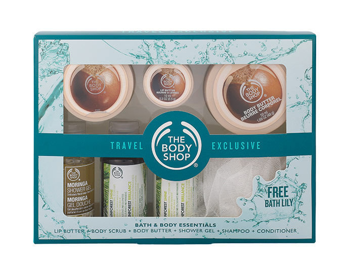 Dárková sada **The Body Shop Bath & Body Essentials Kit**. **Složení kazety**: **Shea Lip Butter 10 ml - Péče o rty** **Shea Sugar Body Scrub 50 ml - Tělový peeling** Jemný tělový peeling The Body Shop Shea Sugar Body Scrub dokonale odstraňuje odumřelé kožní buňky. Šetrně čistí pokožku a vyhlazuje ji. Zanechává pokožku hedvábně jemnou a zářivou. **Použití**: Aplikujte na pokožku 1x týdně. Důkladně opláchněte. **Shea Body Butter 50 ml - Tělové máslo** Tělové máslo The Body Shop Shea Body Butter okamžitě pokožku hydratuje a zjemňuje. Složení obsahuje bambucké máslo, které dodává pokožce potřebnou hydrataci. Po použití bude pokožka jemná, vyživená a hydratovaná. Příjemná vůně růžového grapefruitu probudí všechny Vaše smysly. **Aktivní látky**: · bambucké máslo **Použití**: Aplikujte na čistou a suchou pokožku. **Moringa Shower Gel 60 ml - Sprchový gel** Sprchový gel The Body Shop Moringa Shower Gel s jemnou květinovou vůní příjemně osvěží pokožku a zanechává pocit svěžesti během celého dne. **Rainfores Shine Shampoo 60 ml - Šampón** Šetrně čistí a odstraňuje veškeré nečistoty. Zanechává vlasy svěží, jemné a hydratované. **Použití**: Aplikujte na mokré vlasy. Jemně masírujte a poté důkladně opláchněte. **Rainfores Shine Conditioner 60 ml - Kondicionér** Vlasům dodává potřebnou hydrataci a oslnivý lesk. **Použití**: Aplikujte na umyté vlasy. Nechte chvíli působit a poté důkladně opláchněte. **Mycí houbička**