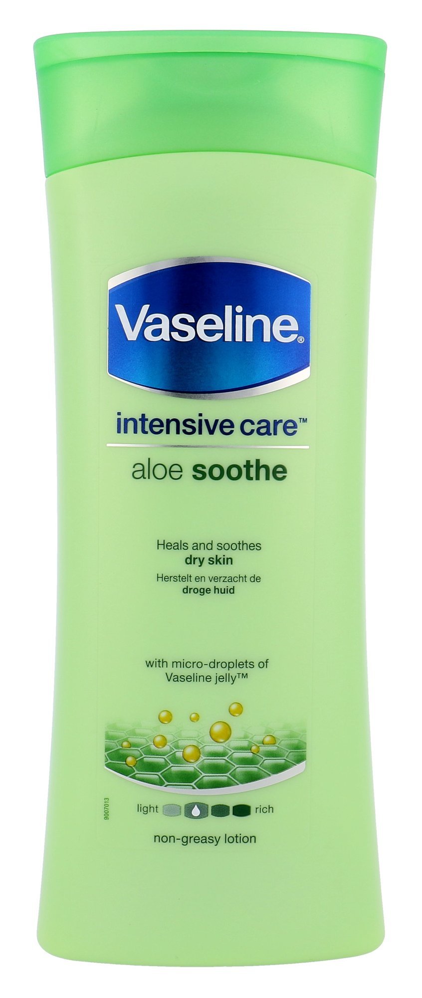 Tělové mléko** Vaseline Intensive Care Aloe Soothe Lotion**. Tělové mléko Vaseline Intensive Care Aloe Soothe Lotion pro hloubkovou hydrataci suché pokožky. Optimálně pokožku hydratuje a zabraňuje vysušování. Složení s obsahem Aloe pomáhá pokožku zklidňovat a zabraňuje jejímu podráždění. Jemná konzistence se ihned vstřebává a nezanechává na pokožce mastný film. **Použití**: Aplikujte na suchou a čistou pokožku.