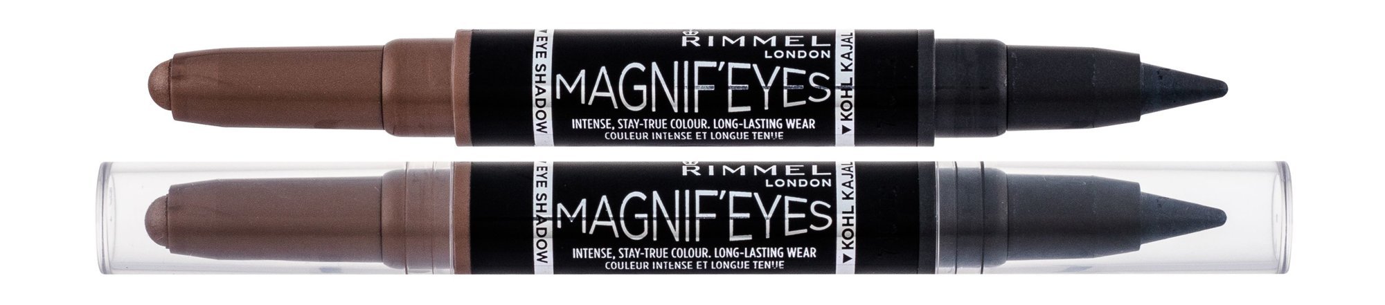 Oční stíny a kajalová tužka 2v1** Rimmel London Magnif Eyes**. Oční stíny a kajalová tužka 2v1 mají krémovou konzistenci s vysokou pigmentací, která má dlouhotrvající výdrž trvající až 24 hodin. Jednotlivé odstíny očního stínu a kajalové tužky s jemným shimmerem k sobě dokonale ladí, čímž umožní vytvořit dokonalé líčení očí během okamžiku. Unikátní složení nezalézá do vrásek. Praktické balení 2v1 je praktické na cesty. S očními stíny a kajalovou tužkou 2v1 z řady Magnif Eyes bude Vaše líčení dokonalé po celý den. **Poznámka:** Vyobrazený odstín může být spíše orientační, záleží na nastavení barev Vašeho monitoru.