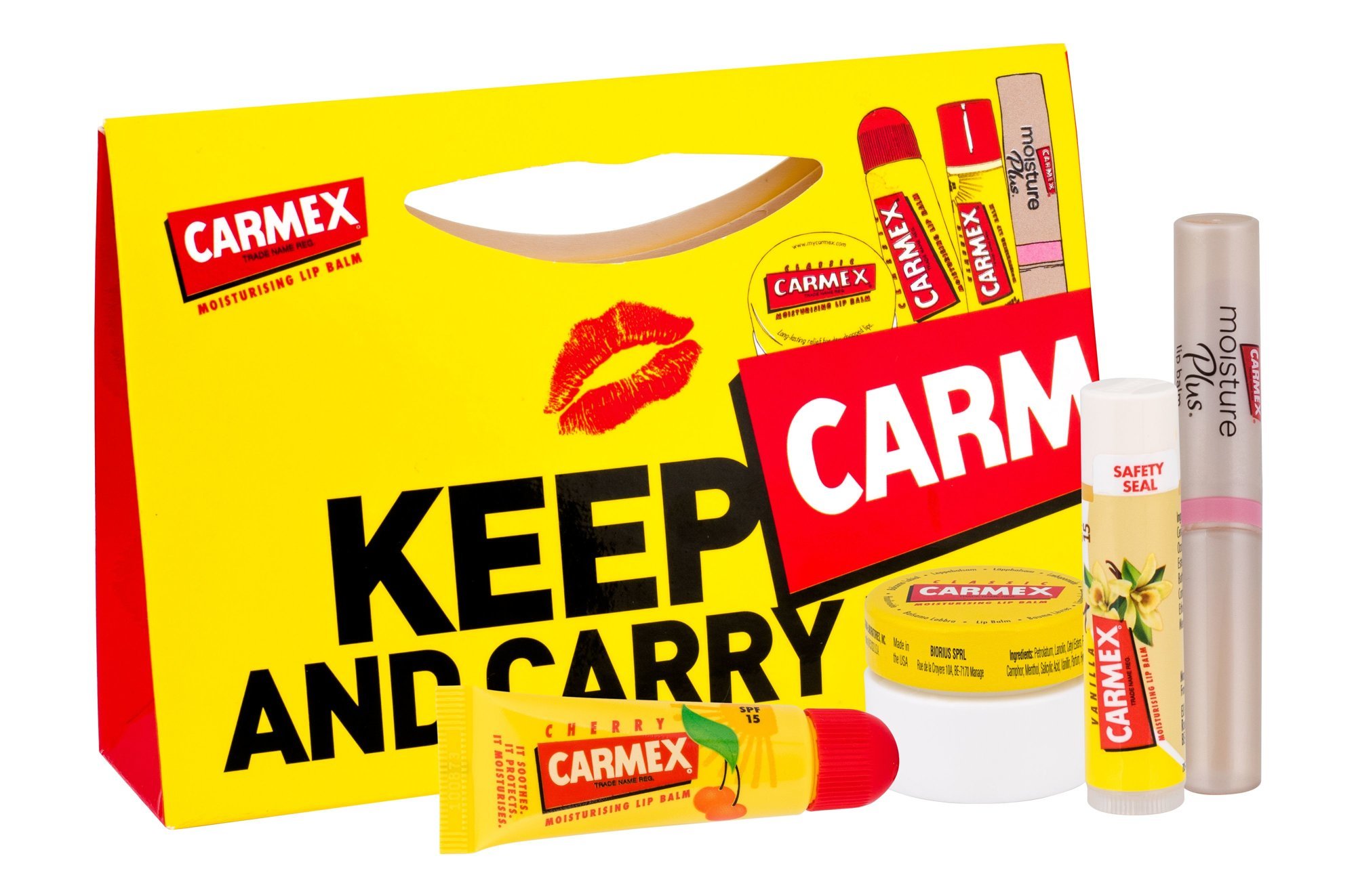 Dárková sada **Carmex**. Balzám Carmex zklidňuje rty a dodává jim potřebnou hydrataci a výživu. Okamžitě regeneruje suché a popraskané rty. Rtům navrací hebkost a jemnost. **Použití**: Aplikujte na rty dle potřeby. **Složení kazety**: balzám na rty Classic 7,5 g balzám na rty SPF15 10 g Cherry balzám na rty SPF15 4,25 g Vanilla balzám na rty Moisture Plus 2 g Pink