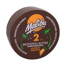 Přípravek pro rychlejší opálení **Malibu Bronzing Butter SPF2**. Máslo Malibu Bronzing Butter SPF2 je určen pro pokožku, která se snadno opalí a není náchylná ke spálení. Díky obsahu beta carotenu je opálení snadnější. Kvůli nízké SPF ochraně není vhodné pro děti. **Použití:** Naneste rovnoměrně na pokožku 30 minut před sluněním.