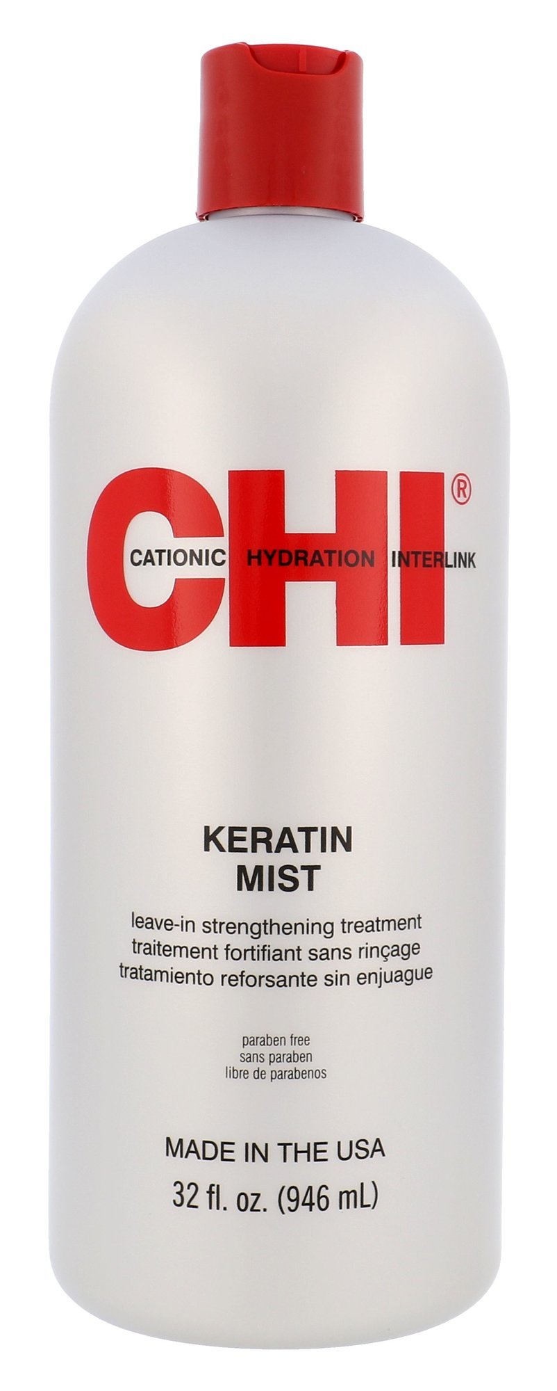 Intenzivní regenerační kúra bez oplachování **Farouk Systems CHI Keratin Mist**. Keratin Mist je lehká keratinová výživa na vlasy ve spreji bez nutnosti smývání, která zajišťuje vlasům hlubokou hydrataci a lesk. Slouží k prodloužení trvanlivosti intenzivních barevných odstínů a zajištění vysokého lesku barvených vlasů. Obsahuje keratin, který proniká do struktury vlasů a doplní poškozená místa. Udržuje přirozenou vlhkost ve vlasech. Vyživuje a chrání barvený vlas. **Použití**: Aplikujte na vlhké vlasy.
