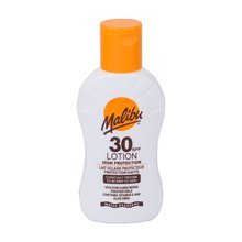 Mléko na opalování **Malibu Lotion SPF30**. Mléko Malibu Lotion SPF30 poskytuje pokožce střední ochranu před slunečním zářením. Mléko pokožku hydratuje, zvláčňuje, vyživuje a zabraňuje podráždění. Voděodolné složení. Použití: Aplikujte na suchou a čistou pokožku.
