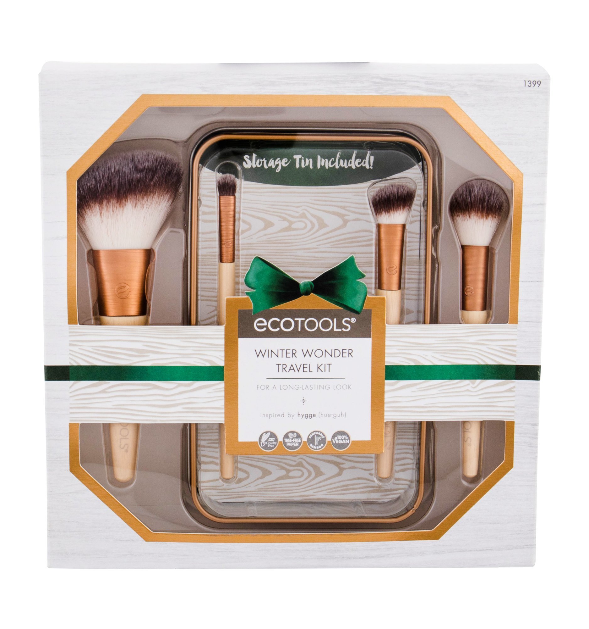 Cestovní sada kosmetických štětců **EcoTools Winter Wonder Travel Kit.** Sada mini kosmetických štětců, inspirovaná životním stylem Hygge, vytvoří nádherný zdravý zimní look. Produkty v sadě nebyly testovány na zvířatech. Jsou 100% veganské a na rukojeti bylo použito pouze bambusové dřevo. Se sadou Winter Wonder Travel Kit budete vypadat jako políbená svěžím zimním vánkem. **Složení kazety:** precizní štětec na pudr **EcoTools Precision Powder 1 ks.** Kosmetický štětec s hustými delšími syntetickými vlákny a bambusovou rukojetí umožní snadnou aplikaci sypkého i kompaktního pudru. štětec na rozjasňovač a tvářenku **EcoTools Controlled Setting 1 ks.** Kosmetický štětec kulatého tvaru se syntetickými vlákny a bambusovou rukojetí slouží k aplikaci tvářenky a pudrového rozjasňovače. Výsledkem je svěží vzhled. plochý štětec na oční stíny **EcoTools Angled Crease 1 ks.** Kosmetický štětec plochého tvaru se syntetickými vlákny a bambusovou rukojetí slouží k aplikaci očních stínů po celé ploše očního víčka. zkosený štětec na oční stíny **EcoTools Accent Shadow 1 ks.** Zkosený štětec se syntetickými vlákny a bambusovou rukojetí lze využít na rozmazání přechodů očních stínů, pro nanesení rozjasňovače v detailních oblastech tváře, jako je obočí, nos nebo horní ret. **plechová krabička 1 ks**