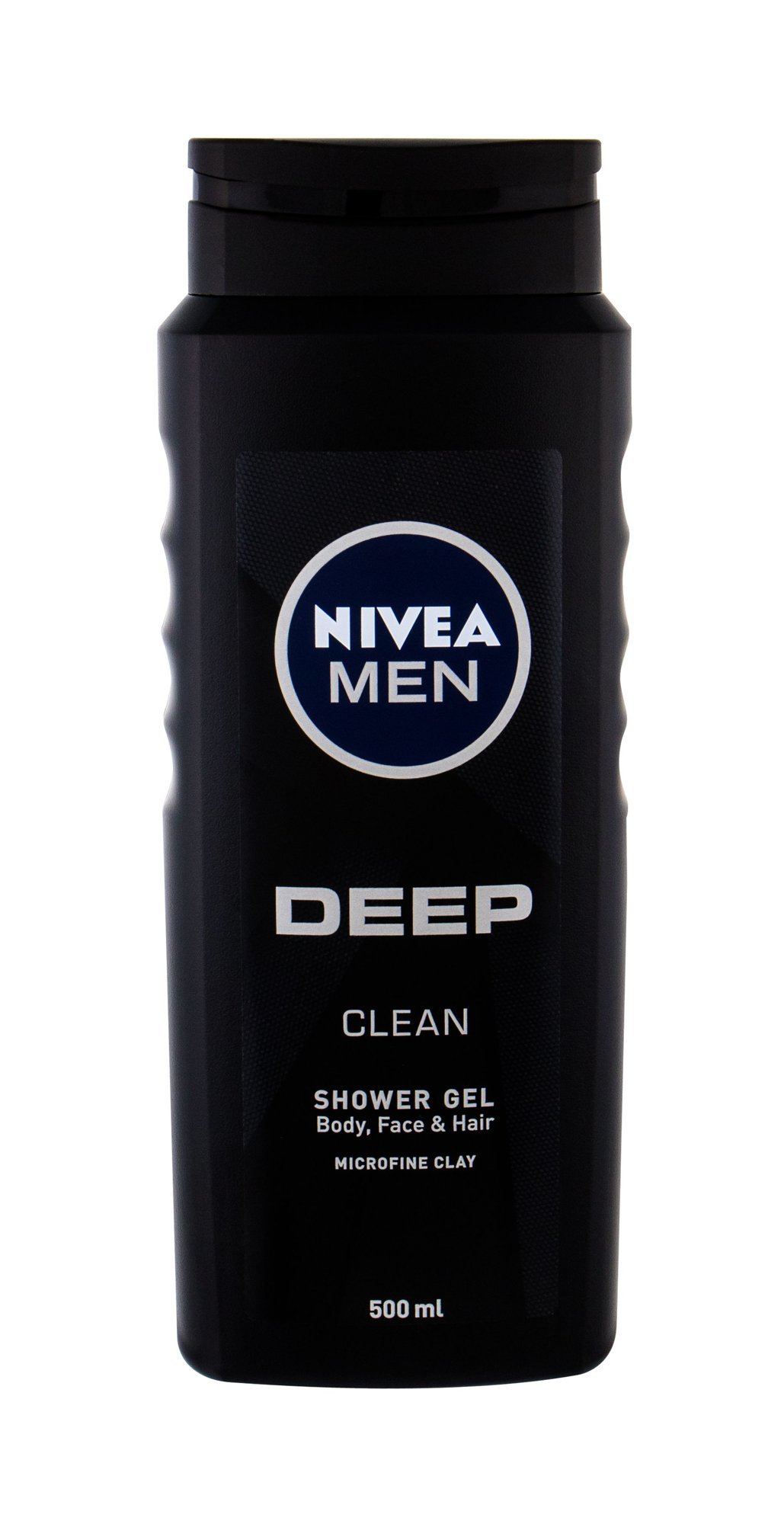 Sprchový gel na tělo, tvář a vlasy **Nivea Men Deep Clean Shower Gel**. Sprchový gel Nivea Men Deep Clean Shower Gel obsahuje pečující složení s přírodním jílem, který snadno odstraňuje nečistoty. Po každém sprchování pocítíte příliv nové energie. **Použití:** Během sprchování aplikujte na mokrou pokožku a vlasy. Krouživými pohyby vytvořte pěnu a opláchněte.
