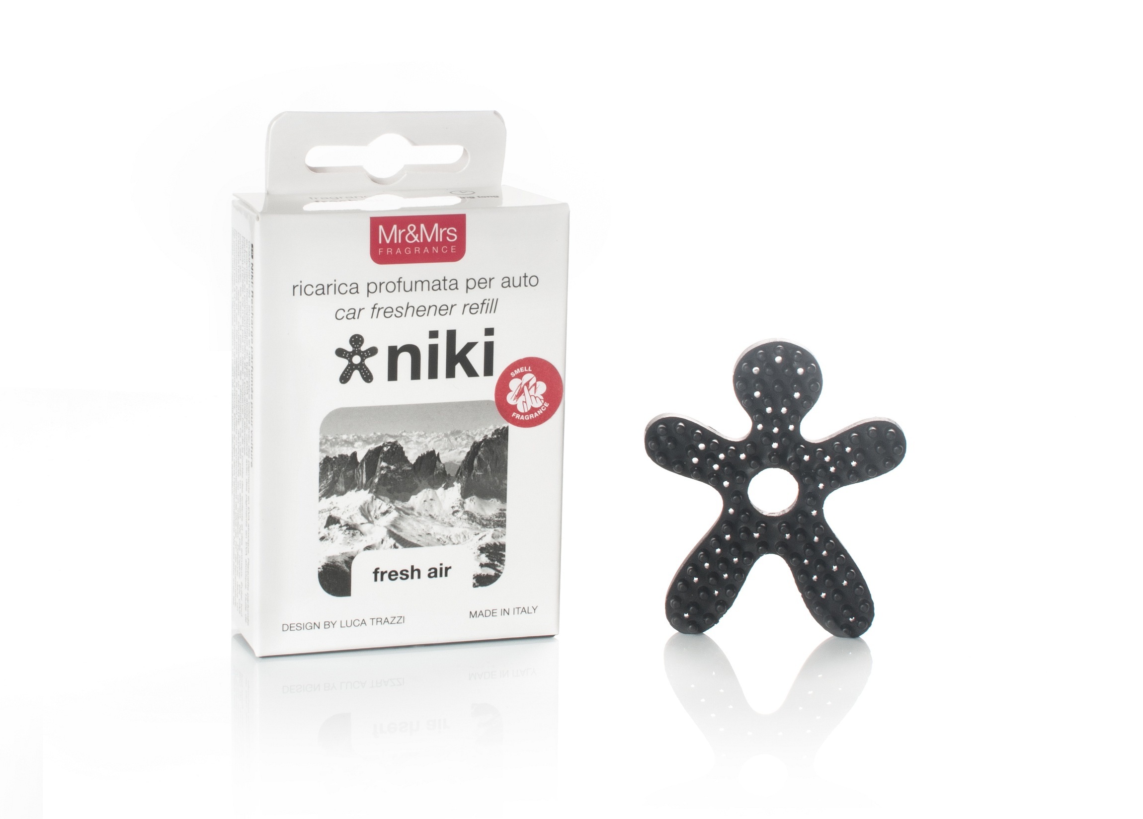 Osvěžující vůně do auta **Mr&Mrs Fragrance Niki Fresh Air**. Osvěžovač vzduchu do auta Mr&Mrs Fragrance Niki s osvěžující vůní čerstvého vzduchu v originálním tvaru panáčka. Vůně Mr&Mrs Fragrance Niki redukuje nepříjemné zápachy, snadno se aplikuje a zajišťuje dlouhotrvající svěžest. **Vlastnosti**: · osvěžuje vzduch · redukuje nepříjemné pachy · jednoduchá aplikace