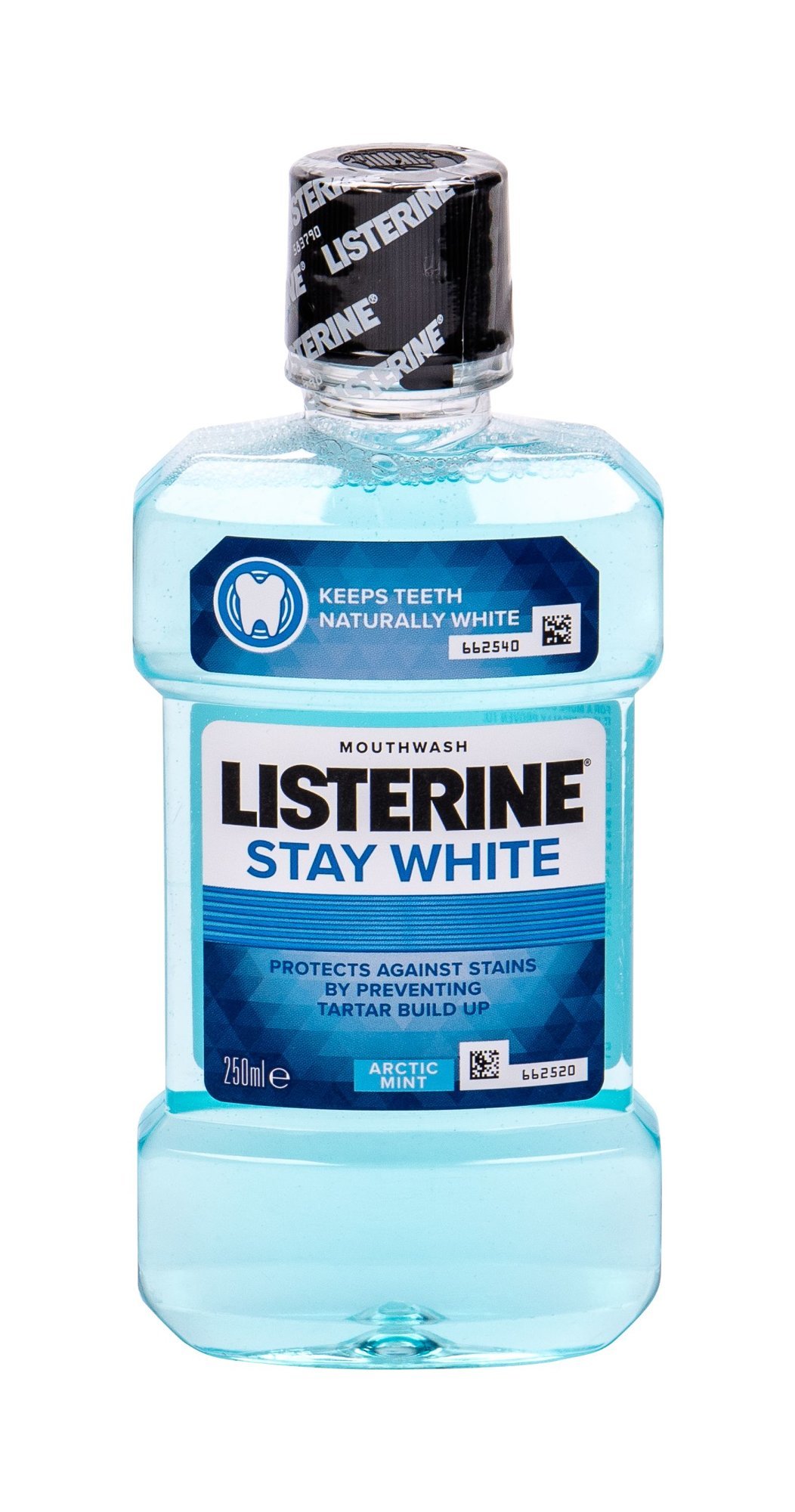 Ústní voda **Listerine Mouthwash Stay White**. Ústní voda Listerine Mouthwash Stay White chrání před tvorbou zubního kamene. Osvěžuje dech a ničí škodlivé bakterie i v mezizubním prostoru. Listerine Mouthwash Stay White je vhodný pro každodenní používání. číst celé