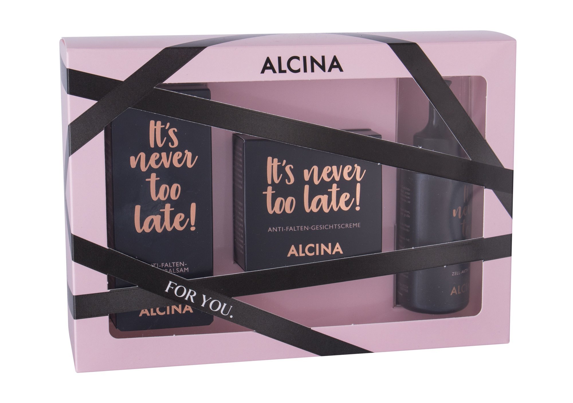 Nikdy není pozdě začít bojovat proti vráskám a stárnutí pleti! **Pleťová péče ALCINA It´s Never Too Late!** se může stát vaší účinnou zbraní. ### Omlazující krém proti vráskám ALCINA It's Never Too Late! Anti-Wrinkle Face Cream 50 ml Pleťový krém díky svému složení pleť regeneruje a vitalizuje. Podle klinických studií dokáže již za dva měsíce pravidelného používání omladit pokožku až o 5 let. **Jaké benefity vám ALCINA It´s Never Too Late! může nabídnout?** * zjemňuje stávající vrásky a předchází vzniku nových, * obnovuje pružnost a pevnost pleti, * podporuje obranyschopnost pleti a chrání ji proti volným radikálům, * intenzivně vyživuje a hydratuje. **Jaké hvězdné složení má tento krém?** * Matrixyl kolagen - podporuje samoregenerační procesy, zvyšuje pevnost a pružnost pleti, * koenzym Q10 - bojuje proti volným radikálům, pomáhá vyhlazovat vrásky, * vitamín E - hydratuje, má antioxidační účinky. **Jakým způsobem pleťový krém používat?** Aplikujte ráno a/nebo večer na vyčištěný obličej, krk a dekolt. ### Oční balzám proti vráskám ALCINA It's Never Too Late! Anti-Wrinkle Eye Balm 15 ml Vaše oční okolí si zaslouží výjimečnou péči, protože právě zde obvykle vznikají první vrásky. Oddalte všechny známky stárnutí pomocí očního balzámu ALCINA! **Jedinečné účinky očního balzámu It’s Never Too Late!:** * redukuje známky stárnutí v očním okolí, * zjemňuje a vyhlazuje vrásky, * hydratuje a vyživuje pokožku, * navrací pleti pružnost a pevnost, * bojuje proti předčasnému stárnutí. **Jak používat balzám na oči ALCINA?** Každé ráno a večer nanášejte balzám na čistou pleť v okolí očí. ### Omlazující pleťové tonikum ALCINA It’s Never Too Late! Cell-Active Tonic 50 ml Podpořte omlazující účinky vašeho krému díky pleťovému toniku ALCINA. **Benefity omlazujícího toniku It’s Never Too Late:** * jemně exfoliuje pleť, * čistí a redukuje póry, * stimuluje přirozenou obnovu kožních buněk, * minimalizuje vrásky a pigmentové skvrny, * odstraňuje nečistoty, suché šupinky i přebytečný kožní maz, * zlepšuje absorpci pečujících přípravků. * **Správné použití tonika ALCINA:** Nanášejte tonikum na pleť pomocí vatového tamponu každé ráno a večer.
