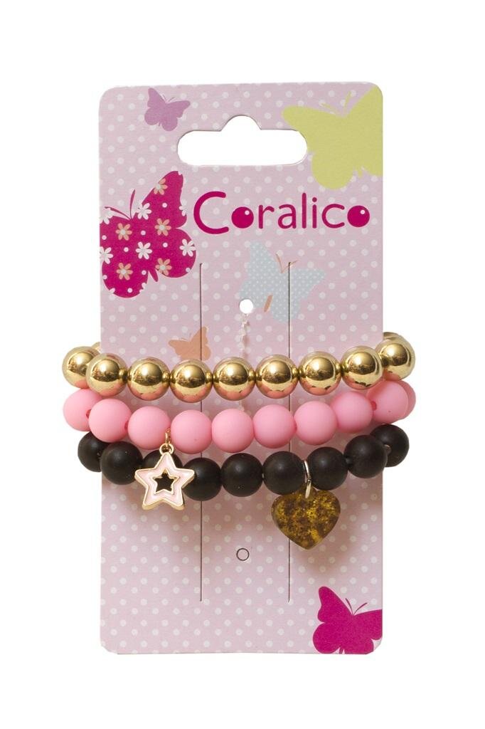 Zestaw trzech bransoletek z gwiazdką i serduszkiem. Bransoletki w kolorze złota, różowa i czarna. číst celé