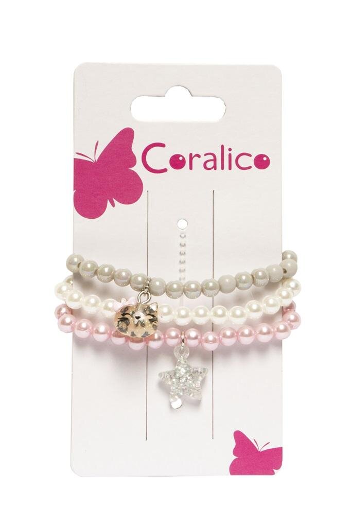 Zestaw trzech bransoletek z kotkiem i serduszkiem. Bransoletki w kolorze różowym, perłowym i białym. číst celé