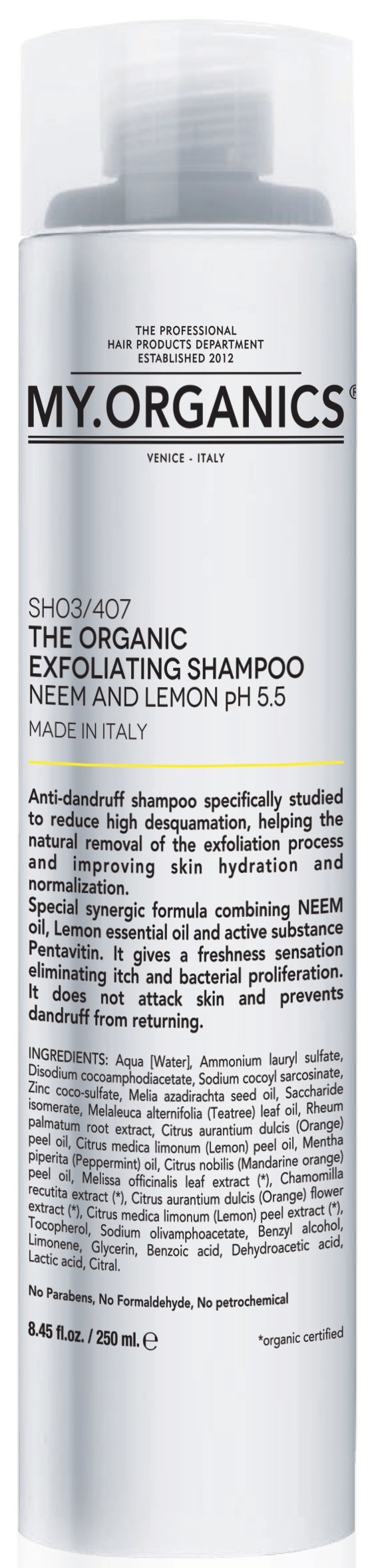 Cílem produktové řady MY.ORGANICS My.Scalp je nabídnout zákazníkům sortiment produktů s mimořádné blahodárnými účinky na vlasovou pokožku a vlasy. My.Scalp je nová trichologická produktová řada, která vznikla na základě nesčetných testů a výběru těch nejlepších certifikovaných a účinných aktivních složek, které jsou na trhu k dispozici. Zavedení nového pracovního postupu založeného na peelingu pokožky a použití přírodních produktů v bio kvalitě, mezi něž patří soli, bylinky, esenciální a rostlinné oleje, umožňuje vytvořit specifická cílená ošetření . Šampon MY.ORGANICS The Organic Exfoliating Shampoo Neem And Lemon vyvinut speciálně za účelem snížení nadměrného vzniku šupinek, podpory přirozeného procesu exfoliace a zlepšení hydratace a nastolení normálního zdravého stavu vlasové pokožky. Speciální účinné složení s obsahem nimbového oleje, esenciálního oleje z citronu a aktivní složky Pentavitin. Navrací pocit svěžesti, odstraňuje svědění a zastavuje množení bakterií. Nedráždí pokožku a brání znovuobjevení lupů. Použití: namočit vlasy, nanést šampon rovnoměrně na vlasovou pokožku a vlasy, promasírovat a nakonec spláchnout vydatným množstvím vody. V případě potřeby postup opakujte.