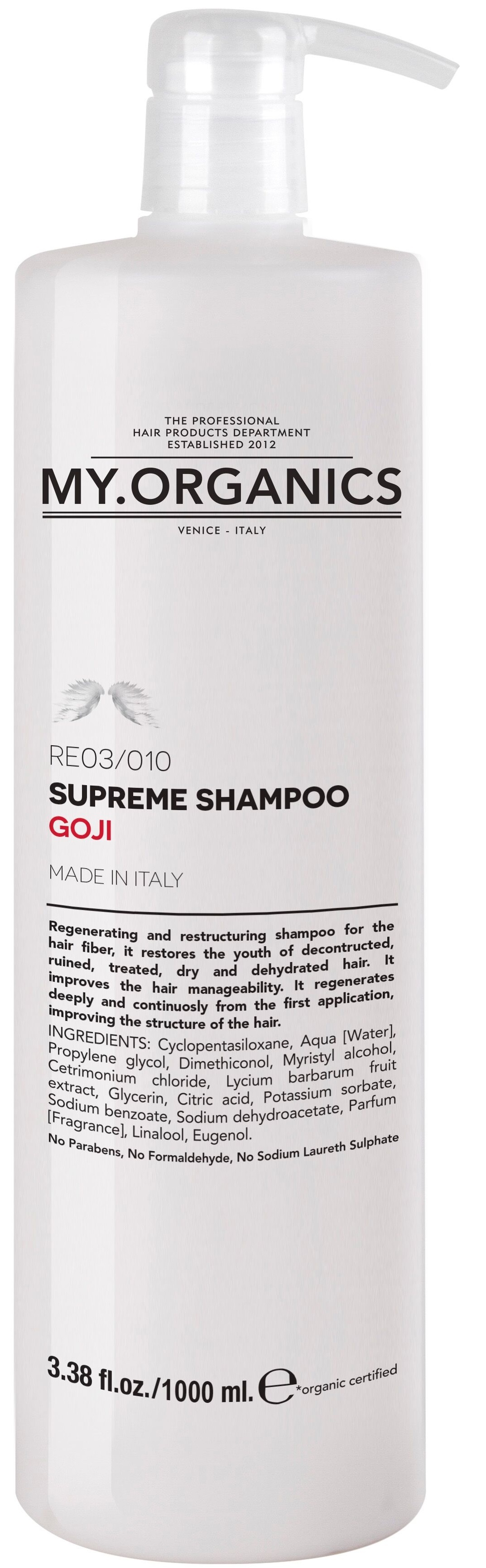 Produktová řada Goji MY.ORGANICS Resurrection má svého druhu jedinečné řešení pro extrémně přetěžované, poškozené, vyčerpané, porézní a velmi suché vlasy ať již z důvodu genetické predispozice nebo v důsledku špatně provedeného barvení, odbarvování nebo jiných chemických úprav nebo působení externích vlivů jako je smog, chlór, sůl nebo opakovaného nesprávného mytí s použitím nevhodných nebo neprofesionálních produktů. Resurrection = vzkříšení je speciální ucelená řada pro rekonstrukci vlasového vlákna. Dokáže poskytnout vlasům hloubkovou intenzivní a dlouhotrvající regeneraci, díky obsahu hodnotných aktivních složek navrací vlasům jejich původní krásu, posiluje jejich vnitřní strukturu a dodává jim sílu, objem a hedvábnou hebkost. Se svým intenzivním účinkem proti projevům stárnutí hloubkově ozdravuje vlasy a dodává jim lesklý a zářivý vzhled. Dodává objem a výživu. Bojuje účinně proti volným radikálům, které jsou důvodem stárnutí kapilárních struktur a tak předchází degeneraci vlasů. Regenerační šampon MY.ORGANICS Supreme Shampoo Goji pro rekonstrukci kapilárních vláken. Vrací původní mladistvý vzhled poškozeným, extrémně zatěžovaným, suchým, vysíleným, porézním, splihlým a dehydratovaným vlasům. Účinek šamponu spočívající v hloubkové a dlouhotrvající regeneraci je viditelný od prvních použití. Použití: Namočte vlasy vodou, naneste šampon rovnoměrně na celý objem vlasů a nechte působit několik minut. Spláchněte a v případě potřeby postup opakujte.