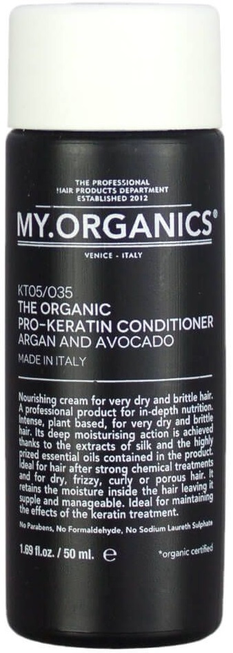 Produkty z řady MY.ORGANICS Keratin díky rekonstrukčním schopnostem keratinu dodávají zdraví a zářivý lesk poškozeným vlasům, které byly vystaveny působení chemických produktů. Při použití kompletní řady dosáhneme hloubkové očisty vlasové pokožky a tím podpoříme a urychlíme regeneraci. Výživný kondicionér MY.ORGANICS The Organic Pro-Keratin Conditioner Argan And Avocado určený na mimořádně suché a poškozené vlasy. Profesionální produkt pro hloubkovou výživu. Za své hloubkové hydratační účinky vděčí obsahu extraktu z hedvábí a hodnotných esenciálních olejů. Ideální pro vlasy výrazně poškozené chemickými úpravami a na suché, krepovité, kudrnaté nebo porézní vlasy. Udržuje vlhkost uvnitř vlasů a zanechává je pružné a snadno upravitelné. Ideální produkt pro prodloužení účinku keratinové kúry.