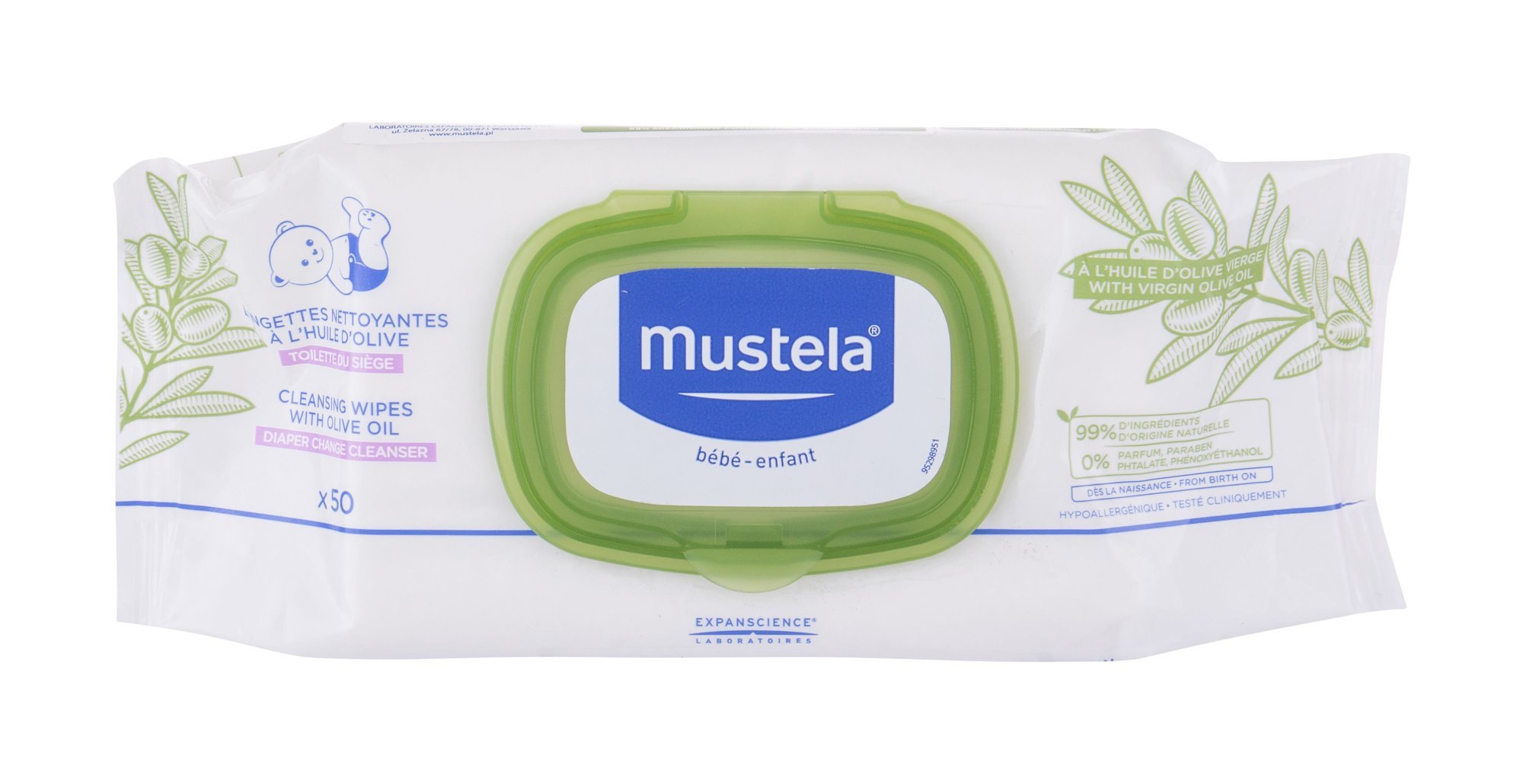 Čisticí ubrousky Mustela Bébé With Olive Oil s obsahem olivového oleje šetrně čistí dětskou pokožku a zároveň o ni pečuje. Mají hypoalergenní, dermatologicky testované složení vhodné pro všechny typy pokožky.