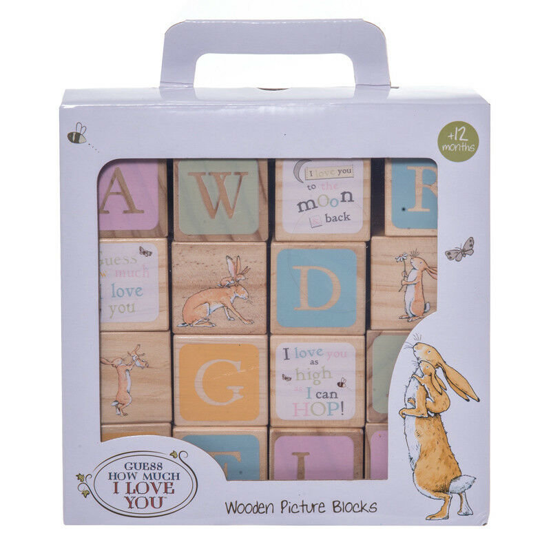 Dřevěné obrazové kostky z limitované série Hádej, jak moc tě mám rád! Každá z 16 kostek je zdobena obrázky, citacemi z klasických knih a písmenem abecedy od A-Z. Firma Rainbow Designs byla založena v roce 1971 mladým podnikatelem Mikem Muttersem. V té době neexistovala značka, která by měla v názvu Rainbow (duha) a proto zvolil toto jméno. Jejich cílem je přinést dětem do života jejich oblíbené postavičky ve fyzické formě plyšáků. Chtějí být nejlepší z nejlepších a jejich hračky jsou vyráběny pod přísnými standardy, také rozvíjí smysly dětí. První licencí Rainbow Designs byli všem známí Disney, vyráběli pro ně módní šperky jako brože, smaltované knoflíky, odznaky, ale také zástěry, batohy a přesky opasků. Po této spolupráci se nabídky jen hrnuly a Rainbow mohli do svého portfólia přidat firmy jako Noddy, The Wombles, Flower Fairies, Mašinka Tomáš a klasického Medvíka Pú. Koncem 70. let vyrobili pod licencí odznaky pro Buckinghamský palác a královnu Alžbětu II. Během roku 1980 až 2010 dále spolupracovali například na medvědovi Paddingtonovi, různých postavičkách Beatrix Potter, Elmerovi a dalších postavičkách ze Sezame, otevři se. V jejich portfóliu najdete i prasátko Peppa, králíčka Petera a další známé postavy.