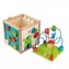 Velká motorická kostka, která nabízí mnoho variant pro rozvoj dítěte. Vrchní část s labytintem je odjimatelná a lze ji také využít jako úložný prostor pro hračky a všechny důležité věcičky naších nejmenších. Na kostce nalezneme spoustu prvků pro smyslový rozvoj a prohloubení motoriky, jako je posuvné bludiště s traktorem, vkládačku s barevnými tvary, otočné pexeso a rotační hlavolam s mlýnem. Vyrobeno z masivního dřeva, plastu a kovu.