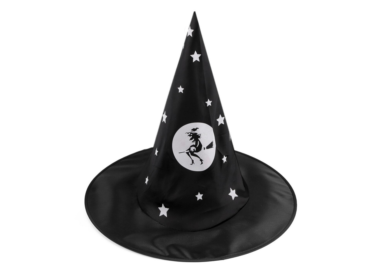 Karnevalový klobouk vás promění v čaroděje nebo čarodějnici. Dobře drží tvar, je z neprůhledné polyesterové tkaniny. Nahoře na přední straně má potisk. Můžete si ho dozdobit dle vlastního vkusu a fantazie. Šířka krempy je 9 cm.Klobouk č.1 má metalický potisk pavučin na celé ploše klobouku, krempu...